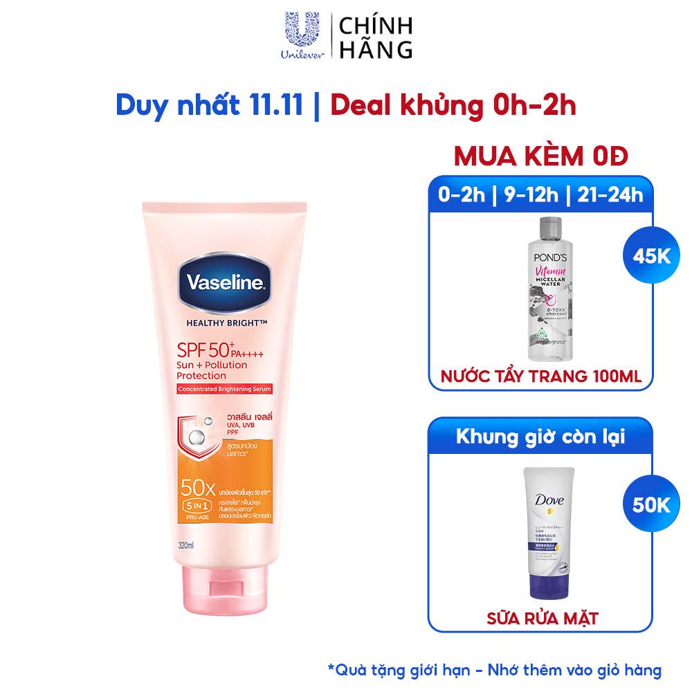 Freeship- Serum chống nắng cơ thể Vaseline 50x bảo vệ da với SPF 50+ PA++++ giúp da sáng rạng rõ với Niacinamide 320ml mua tại đây